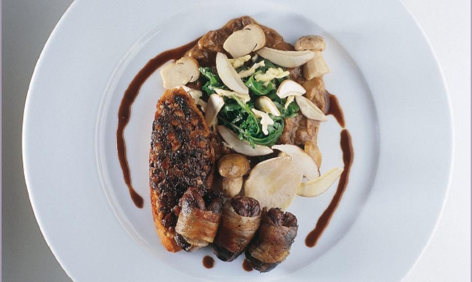 Poitrines de grive au lard de colonna, rôtie d’abattis sur une compotée de cèpes à l’huile d’olive