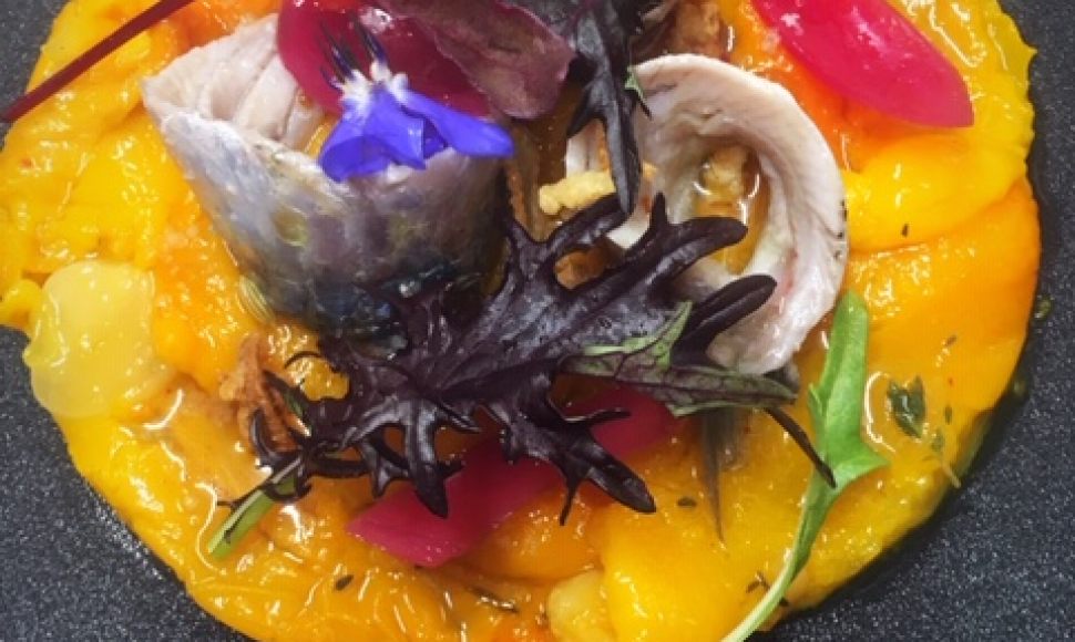 Chauffer le fond blanc. Dans une casserole moyenne et avec un filet d’huile d’olive, faire suer la garniture aromatique sans la colorer. Ajouter 2 gousses d’ail en chemise, le poivre en grain, le persil, le piment d’Espelette, le thym et le romarin.