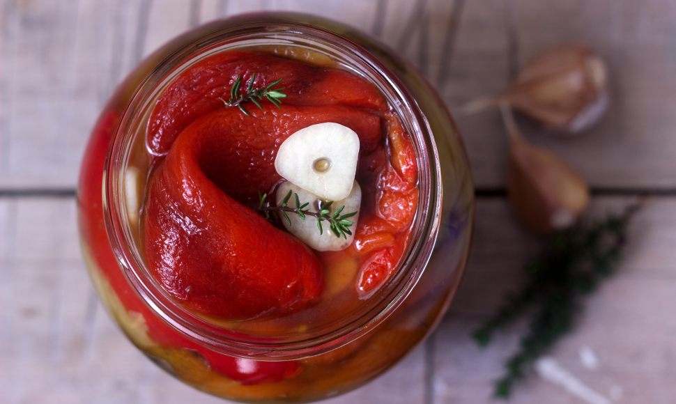Faites griller les poivrons pendant environ 7 à 8 min au four à 250 °C (th.8) sur une plaque. Enfermez-les dans un sac plastique et laissez reposer 5 à 6 min. Une fois grillés, épluchez-les, ouvrez-les en deux, retirez les pépins et mettez-les dans un plat avec l'huile d'olive, l'ail haché, le laurier, le thym et le romarin. Faites confire le tout au four à 80 °C (th.2/3). Conservez-les dans l'huile d'olive.