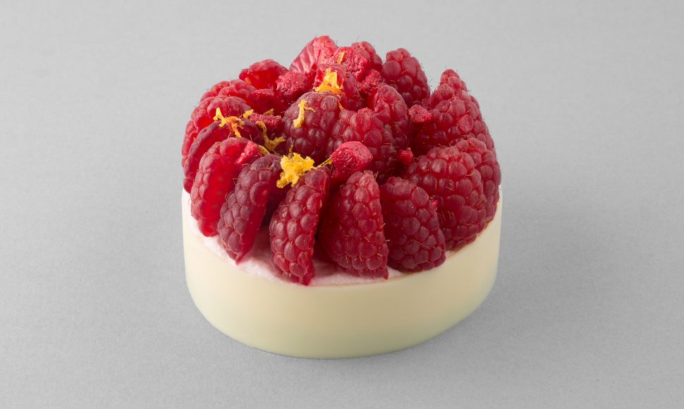 Une pâtisserie composée d'un croustillant de riz soufflé à l'amande, d'une dacquoise pomélo, d'une crème framboise-Timut, d'un confit de framboise.