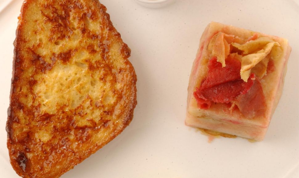 Beurrer un plat allant au four et y ranger les pommes. Mélanger le beurre et le sucre et combler de ce mélange les interstices entre les pommes. Ajouter un filet d’eau. Couvrir le plat, cuire au four à 150 °C, jusqu’à ce que les pommes soient cuites mais encore bien en forme. À la sortie du four, donner une forme cubique à chacune des pommes à l’aide d’une spatule ou la façonner dans un moule carré. Réserver.