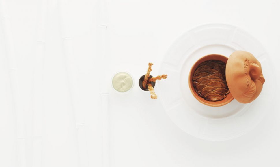 Pomme et poire cuites en romertopf, crème épaisse et sacristains