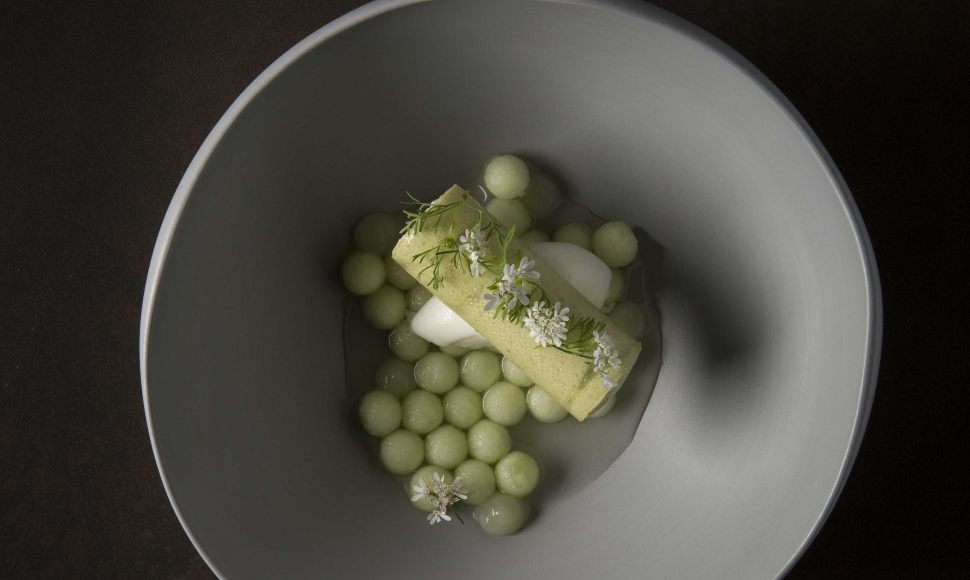 Une mousse onctueuse à la coriandre, surmontée d'une glace au yaourt et d'une soupe aux pommes. Un dessert frais et aérien signé Mauro Colagreco.