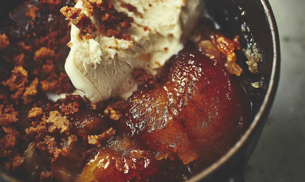 Un dessert savoureux à partager à trois, une fabuleuse cocotte de pommes confites parsemée de crumble au blé noir, le tout accompagné d'une glace à la vanille faite maison. C'est croquant et fondant en bouche !