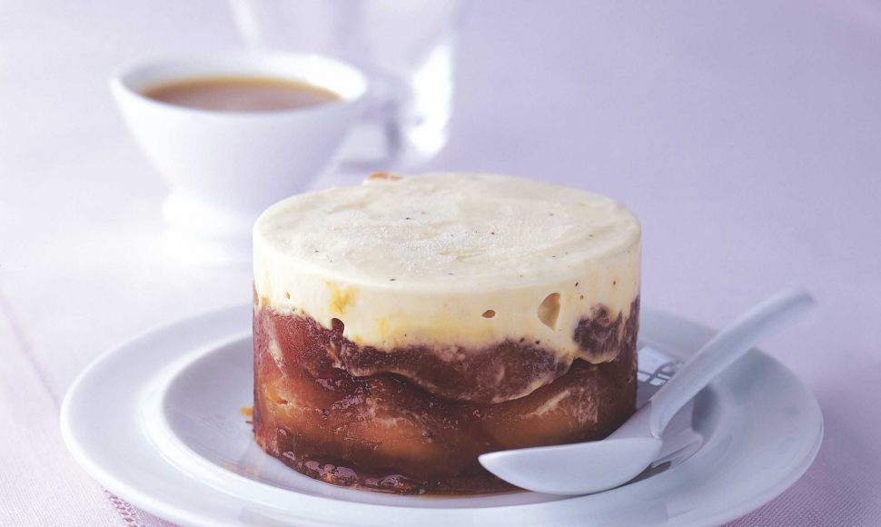 Une tarte tatin de pommes cuites et glace à la vanille, sauce aux épluchures de pommes et cidre.