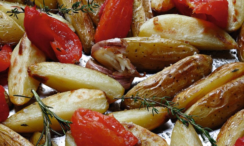Chauffer le four sur 200°C et enfourner le plat pour 30 minutes : remuer les pommes de terre de temps en temps. Quand elles sont cuites, elles doivent être bien dorées : vérifier néanmoins la cuisson avec la pointe d’un couteau. Ajouter alors les pétales de tomates confites et les mélanger. Remettre le plat au four juste 5 minutes pour les réchauffer. Servir dans le plat ou dresser dans les assiettes. Donner un tour de moulin à poivre.
