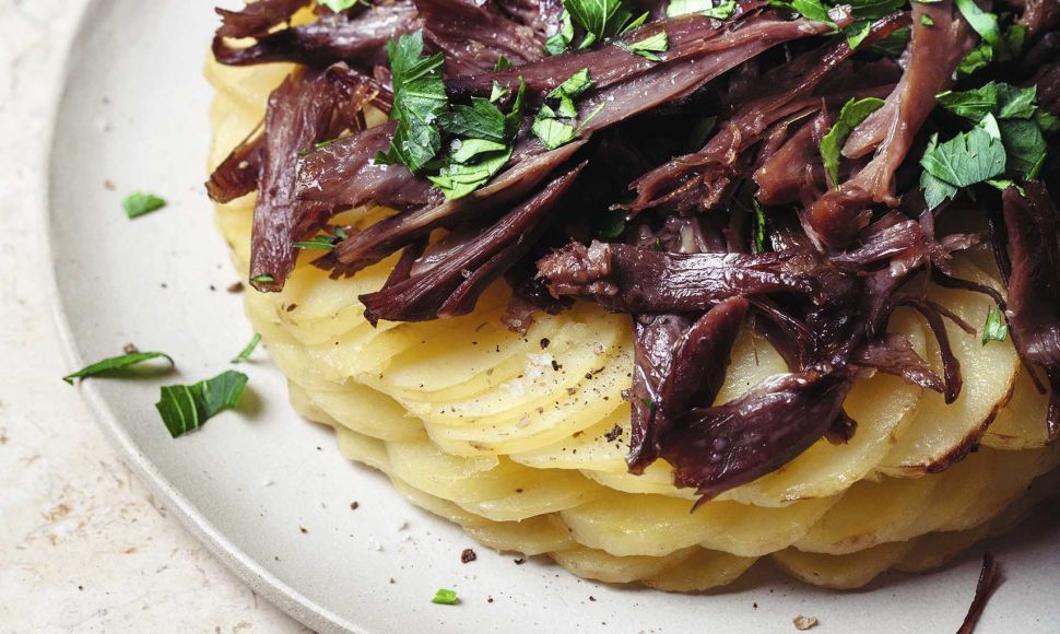 Une tarte de pétales de pommes de terre et de confit de canard, cuite au four avec la graisse de canard.