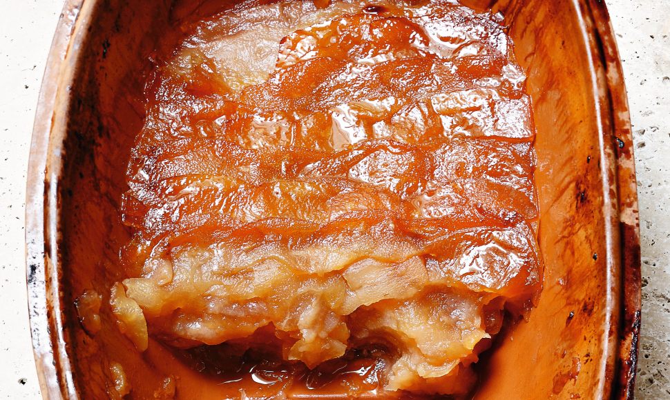 Le trempage du Römertopf est indispensable: la terre de la cocotte se gorge d'eau, qui se restitue en valeur pendant la cuisson: celle-ci est ainsi particulièrement douce, préservant tous les arômes des fruits.