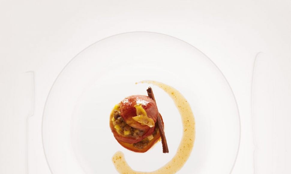 Dans certains recueils de recettes du XVIIIe siècle, on trouve des formules de fruits farcis semblables. Les « Pomes de relleno » sont farcies de viande de porc et/ou de butiffara mais toujours mélangées avec des biscuits. Nous avons gardé tous les ingrédients mais en les cuisinant autrement.
