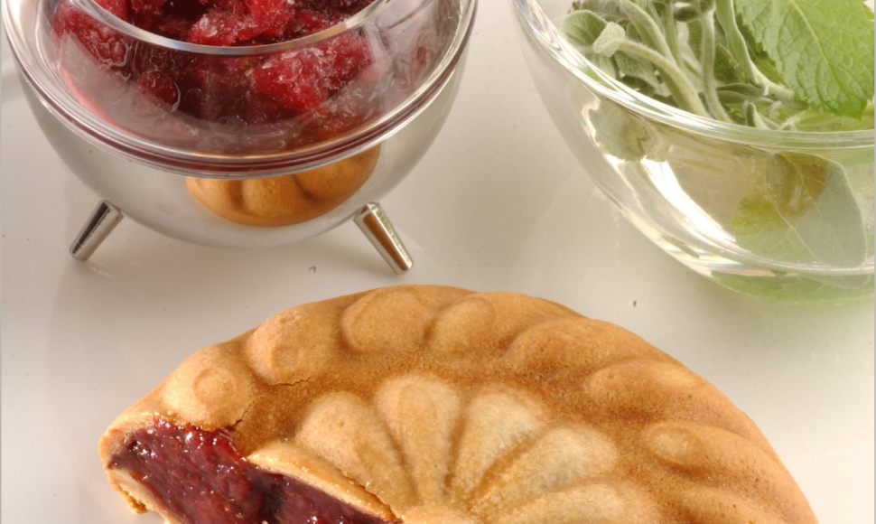Pommes sauvages et prunes rouges en tourte tiède, liqueur d’herbes infusées, granité de vin vieux