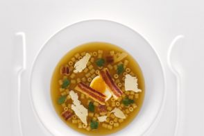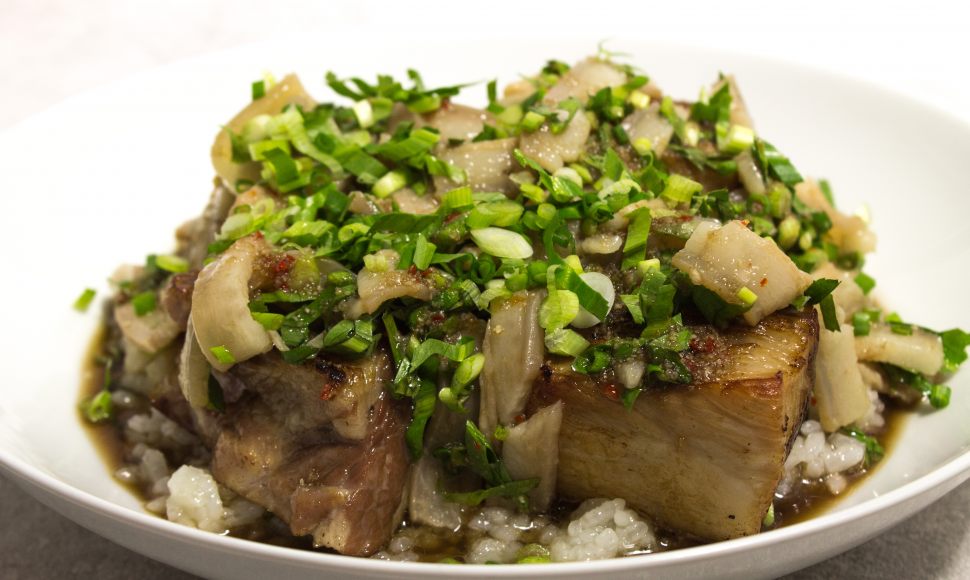 Retirer la couenne de la poitrine de porc et l’émincer en julienne. Puis parer le morceau de poitrine de façon à ce qu’elle forme un rectangle. Les détailler ensuite en 4 rectangles de 5cm de côté environ. Les déposer dans une cocotte avec la couenne et les parures. Verser l’eau, le sucre et le nam pla. Porter à ébullition, écumer. Couvrir la cocotte et cuire à frémissement pendant 1h30 minutes jusqu’à ce les couennes soient translucides et la poitrine très tendre. Décanter les morceaux de poitrine et les réserver sur une grille. Garder la cocotte au chaud.