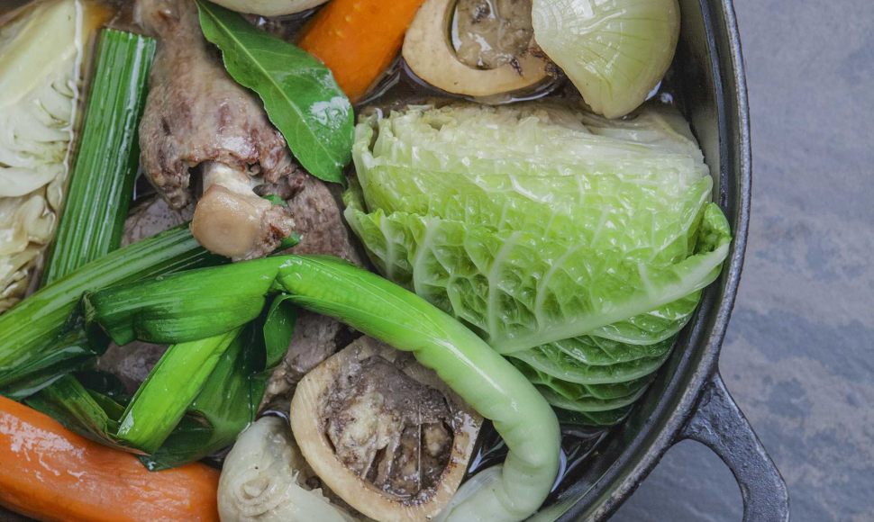 Le pot-au-feu traditionnel avec des morceaux de viande de bœuf et des légumes qui mijotent doucement dans un bouillon parfumé.