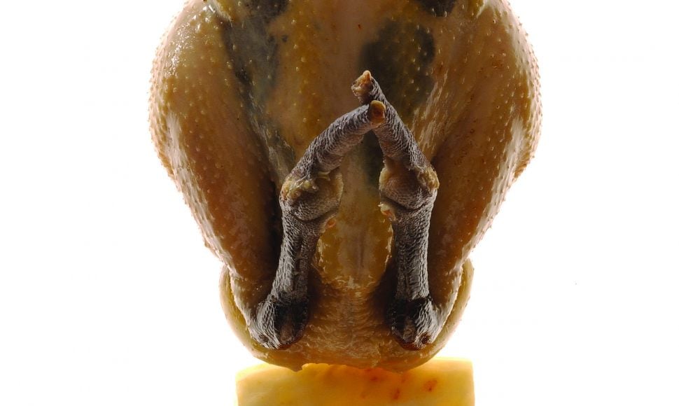 Habiller les volailles en ne laissant qu’un doigt sur les pattes, brûler ces dernières afin de retirer la première peau. Tirer les nerfs des cuisses et sectionner le bout des manchons. Vider les volailles et ôter les parties grasses. Retirer le bréchet. Passer délicatement 2 doigts entre la peau et la chair des suprêmes pour décoller la peau. Passer 3 lamelles de truffe dans l’huile de truffe et les glisser sous la peau de chaque suprême.
