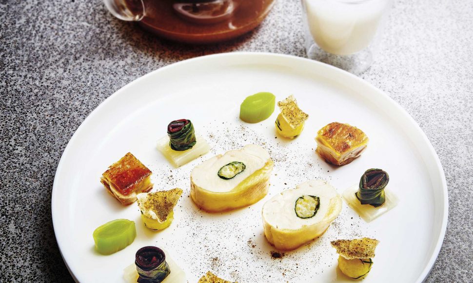 L’idée de départ était de retrouver l’esprit de la poule au pot, un plat familial et hivernal qui occupe une place importante dans mes souvenirs. La cuisson des filets de volaille dans un pot de verre fermé permet d’obtenir un résultat proche de la cuisson en vessie. La sauce suprême au macis vient relever le goût de la volaille, et le consommé, quant à lui, apporte puissance et arômes. Une recette très goûteuse et qui peut être sublimée avec de la truffe ou d’autres champignons !