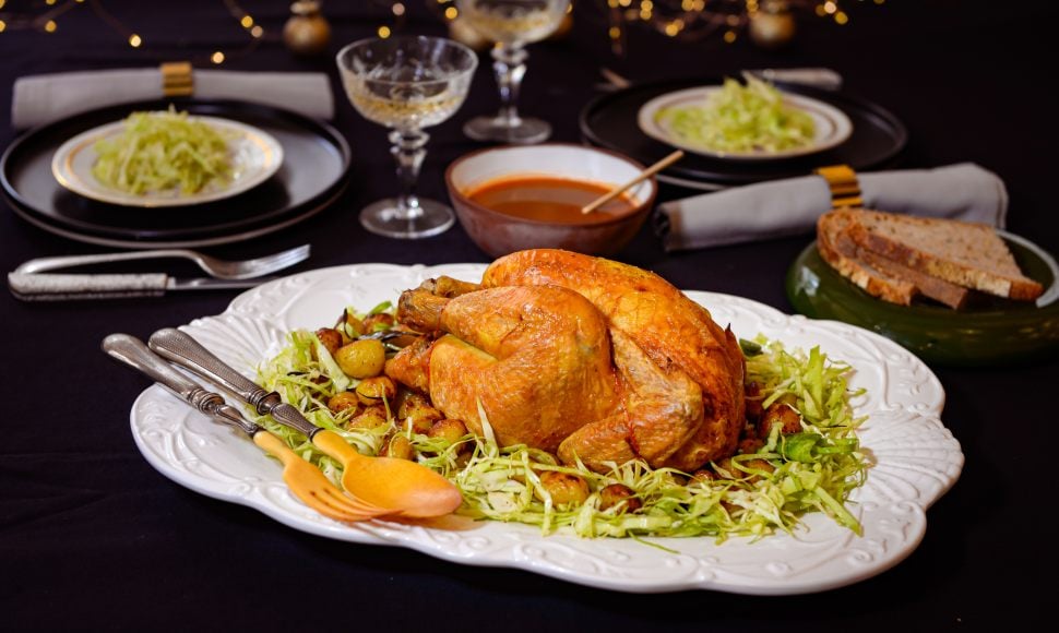 Poularde fermière rôtie, bisque de homard, salade de chou et pommes sautées