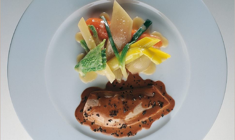 Poule faisane au pot, comme une sauce salmis à la truffe noire, légumes entiers saucés d’un jus vinaigré, gros sel gris
