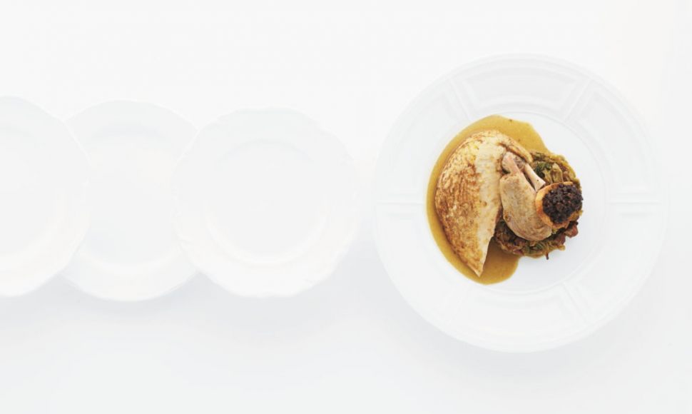 Poule faisane en cocotte, chou braisé, chou braisé, rôtie d’abats