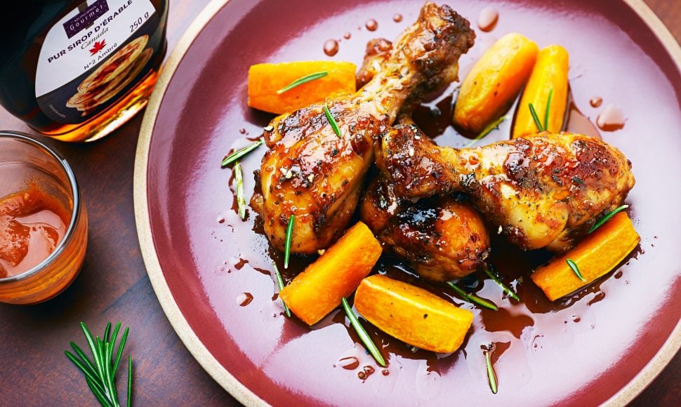 Ciseler et cuire les oignons. Ajouter la sauce ketchup et la gousse d’ail. Laisser mijoter quelques minutes. Ajouter la moutarde, le sirop d’érable, les 4 épices, la sauce soja, le piment de Cayenne et la sauce Worcestershire. Terminer avec quelques gouttes de Tabasco. Laisser mijoter quelques minutes, mixer et chinoiser. Sortir la volaille du frigo et préchauffer le four à 200°C (thermostat 6). Cuire les pilons de poulet avec la marinade environ 25 min. Servir avec de la sauce et des patates douces cuites au four.
