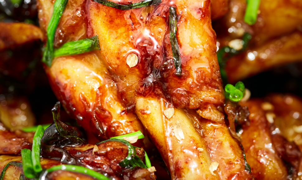 Pelez le gingembre et coupez-le en fines lamelles. Pelez les échalotes et taillez-les en rondelles. Pelez et émincez l’ail. Dans la casserole qui a servi à la cuisson du poulet, versez à nouveau 20 g d’huile. Ajoutez les échalotes et faites-les suer.