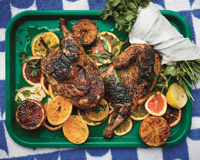 La marinade étant éminemment agréable et la technique très facile, c’est l’occasion rêvée de faire cuire quelques légumes en même temps que le poulet. Choisissez quelque chose qui cuit vite, comme des tranches de fenouil, une botte de ciboules, des piments frais ou des radis coupés en quartiers. Si la recette de base correspond à une cuisson au four, l'autrice Alison Roman a également donné des instructions pour la version au barbecue, car cette marinade se mêle particulièrement bien aux saveurs profondes et fumées issues du gril. Dans ce cas, n’hésitez pas à déposer quelques agrumes coupés en deux sur la grille à côté du poulet. Ils seront parfaits pour arroser la chair au moment de servir.