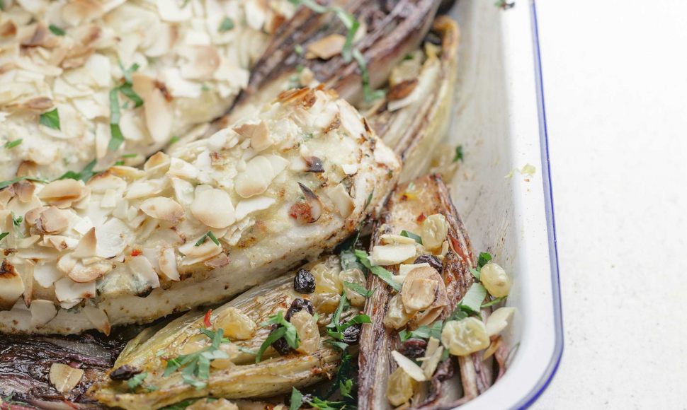 Retournez les endives, versez un demi-verre d’eau et ajoutez les raisins secs. Grattez avec une spatule pour déglacer les sucs et arrosez les endives de ce jus. Laissez cuire encore 5 min en arrosant une fois.