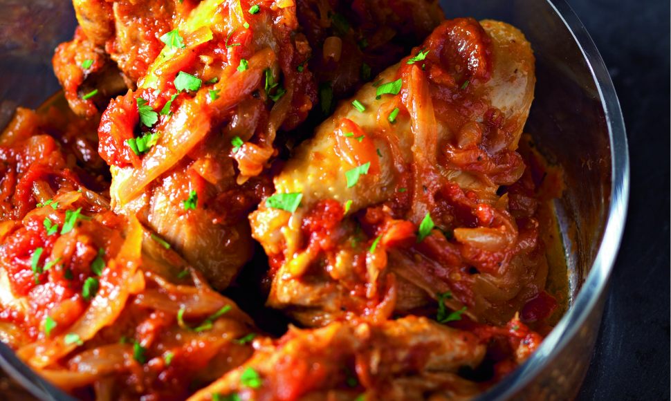 Salez et poivrez les morceaux de poulet. Dans une cocotte, faites-les dorer dans l’huile et le beurre à feu vif 5 min côté peau, puis 5 min de l’autre côté. Ajoutez la sauce avec le vin réduit. Mélangez, laissez mijoter le tout environ 40 min à feu doux jusqu’à ce que le poulet soit cuit et le jus évaporé. Hachez le persil et ajoutez-le. Accompagnez de riz ou de semoule.