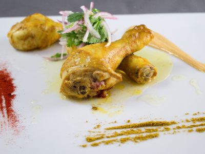 Dresser la volaille au centre de l'assiette. Décorer les bords avec un trait de paprika, un trait de cumin et de reste de marinade. Dresser le condiment sur le poulet et servir aussitôt.