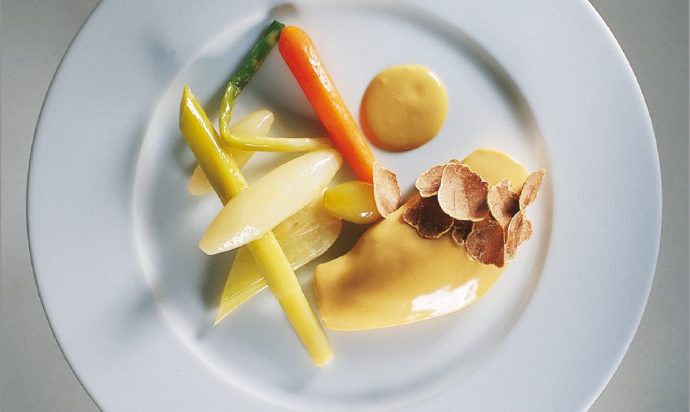 Poulette de bresse truffée en vessie, sauce albufera, légumes au pot, tartufi di alba