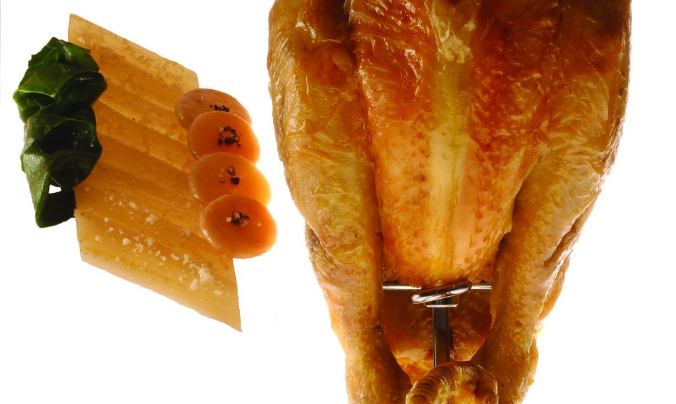 Poulette des landes rôtie à la broche, gratin de côtes de blettes à la moelle, grosses frites à la graisse d’oie