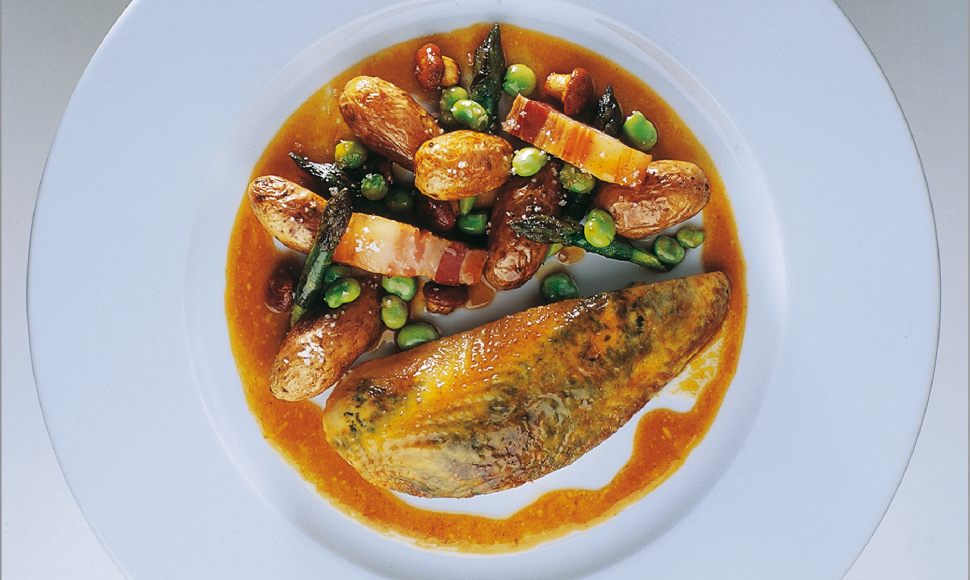 Poulette jaune des landes fourrée sous la peau au beurre d’herbes fraîches, cuisinée en cocotte à l’ancienne aux pommes de terre et asperges rôties