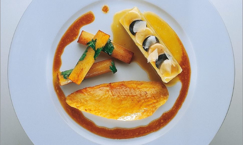 Poulette jaune fermière des landes cuite à la broche, gratin de côtes de blette à la moelle, de grosses frites à la poêle