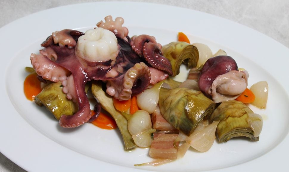 A première vue le poulpe peut être effrayant à cuisiner. C'est pourtant un met des plus savoureux à faire découvrir ou redécouvrir à vos convives cuit dans du vin blanc sec avec sa garniture de légumes et de lard. Un régal pour le palais, par sa texture délicieusement particulière, accompagné d'artichauts juste fondants.