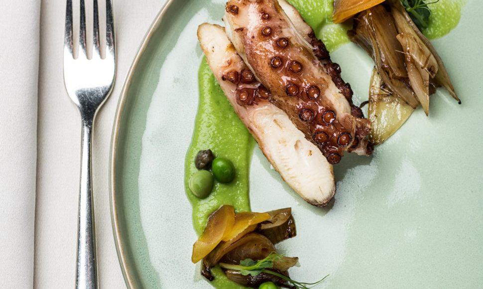 Poulpe parfumé au bois, petits pois crus et cuits, poutargue sarde