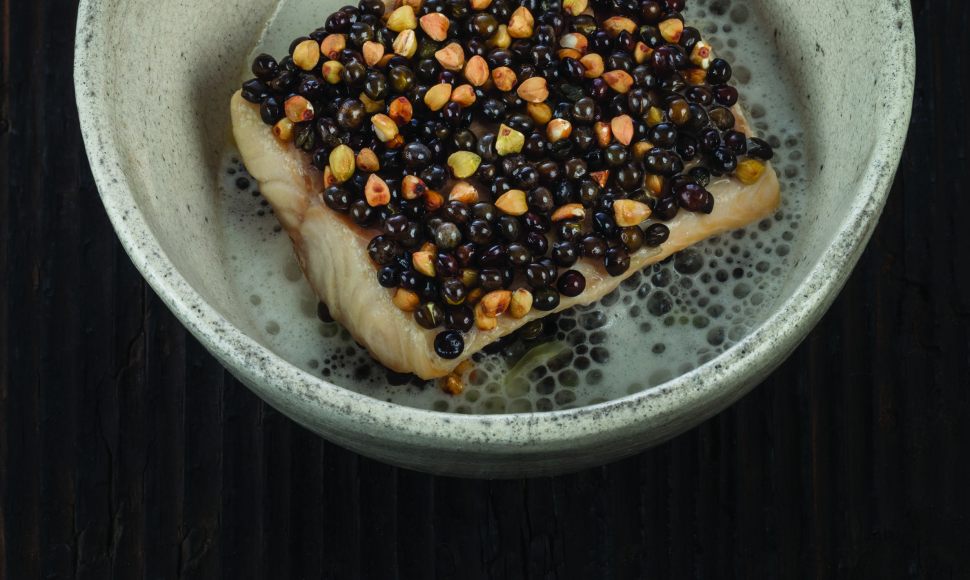 Poutargue de lotte du lac en soupe, omble chevalier, lentilles beluga