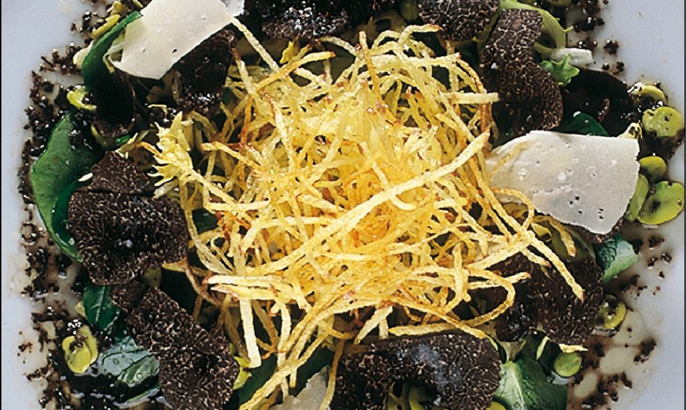 Premières févettes et truffes noires râpées en salade, pommes paille