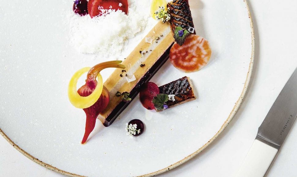 Un pressé de foie gras accompagné d'une purée gélifiée d'anguille fumée, betteraves glacées au jus, pickles, cuites et crues.