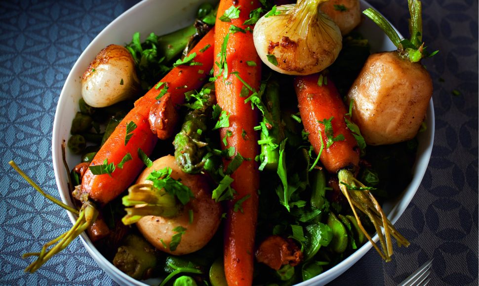 Pelez les carottes, les navets et les oignons en laissant un peu de fane. Versez de l’eau bouillante sur les haricots verts, les fèves, les petits pois, les asperges et les pois gourmands. Laissez-les 5 min dans l’eau puis égouttez-les.