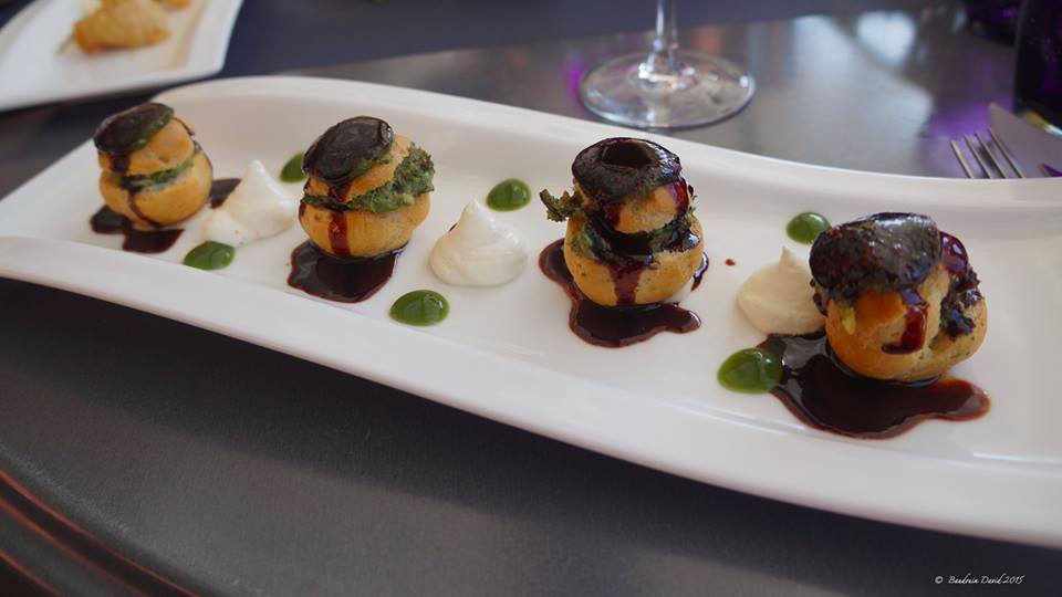 Dans une poêle, faites sauter les escargots avec la préparation d'herbes puis remplissez les choux. Placez au frais 2 heures. Réchauffer la sauce et enfournez les choux au four 3 à 5 minutes à 120 C° Servez avec la crème d'ail et le jus du vigneron.