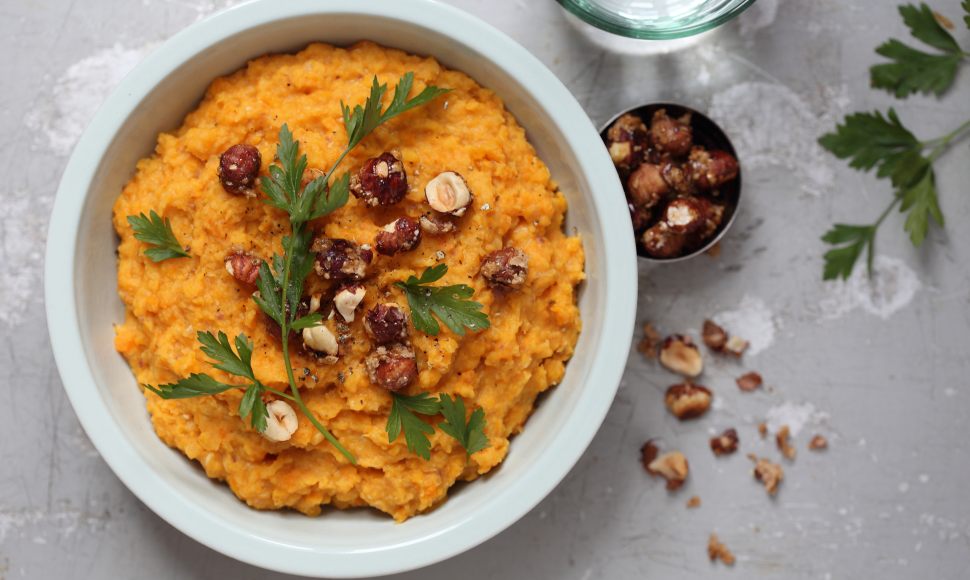 A l’aide du Mixeur Plongeant Triblade équipé de son pied purée extra-large, mixer les légumes cuits directement dans la sauteuse (ou dans un saladier). Goûter et rectifier l’assaisonnement. Ajouter une noix de beurre, décorer de feuilles de persil plat et des noisettes concassées.