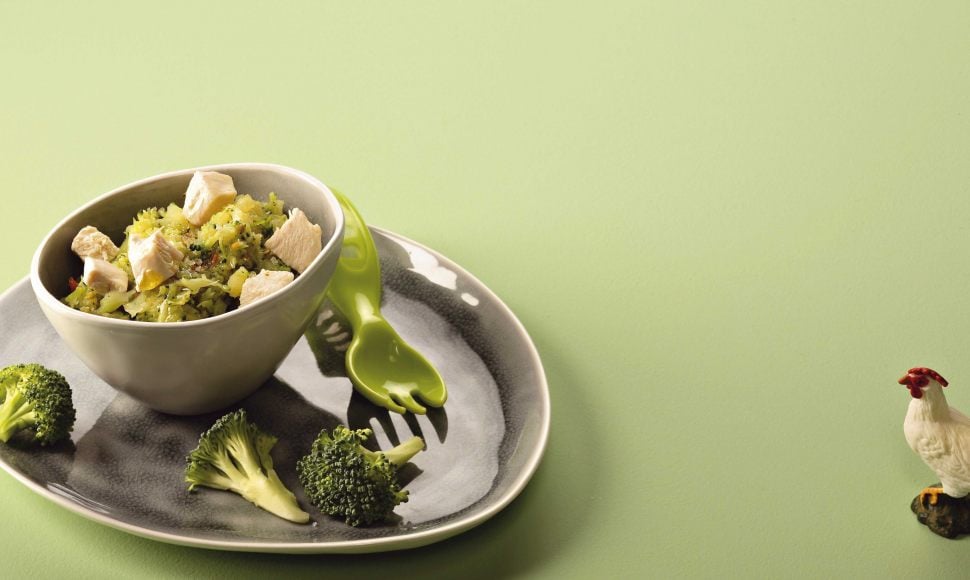Placez le brocoli et le blanc de poireau, la tomate et les pommes de terre dans le panier vapeur. Faites-les cuire 15 min. Jetez le jus de cuisson et mixez en purée en deux impulsions. Disposez la purée de légumes dans une assiette creuse, et posez les dés de poulet dessus, puis laissez couler un léger filet d’huile d’olive.