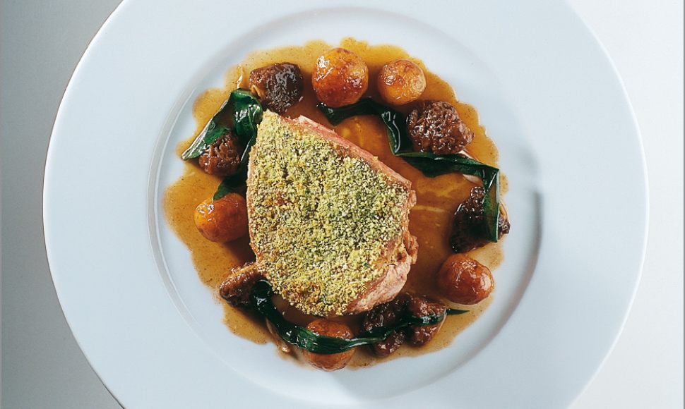Quartiers de chevreau persillés au goût aillé, pommes nouvelles et morilles