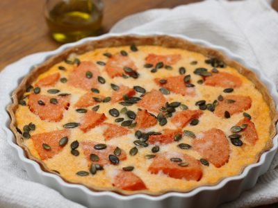 Ajoutez la purée de patate douce au mélange oeufs-fromage-crème et fouettez légèrement. Salez et versez le mélange sur la pâte cuite à blanc. répartissez sur la surface les dés de patate douce restant, le fromage de brebis sec râpé et les graines de courge. Enfournez pour 25 minutes en cuisson intensive. La garniture doit être prise et dorée.