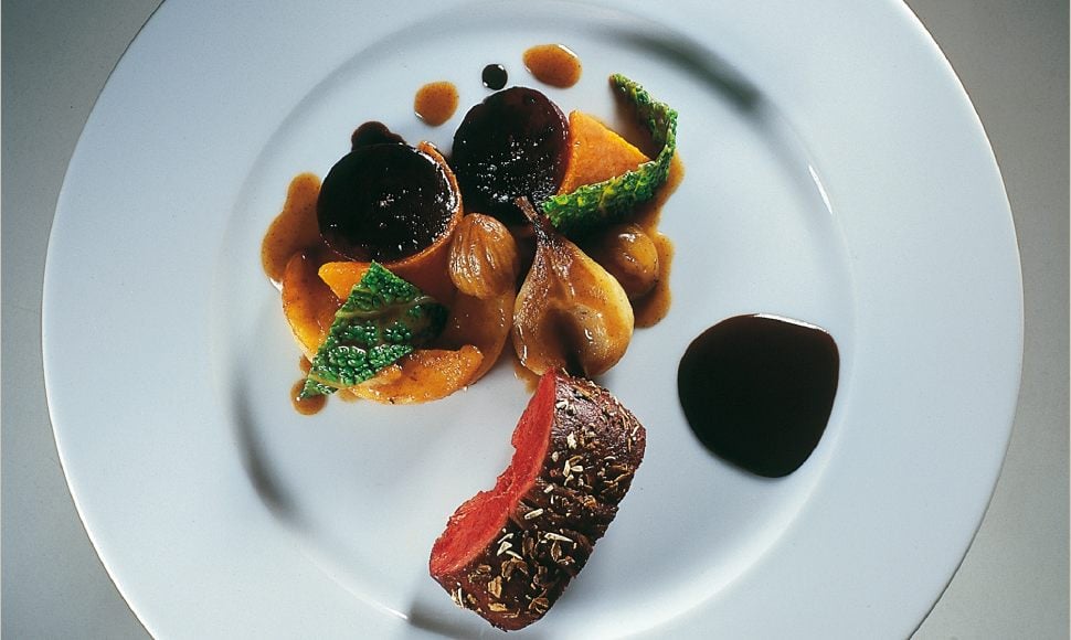 Râble de lièvre de beauce à la broche en dolce forte, sauce de civet corsée, potiron et betterave