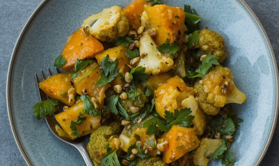 Une ratatouille d'hiver aux carottes fanes, courge butternut, chou-fleur avec des oignons et de l'ail. Rien que ça !