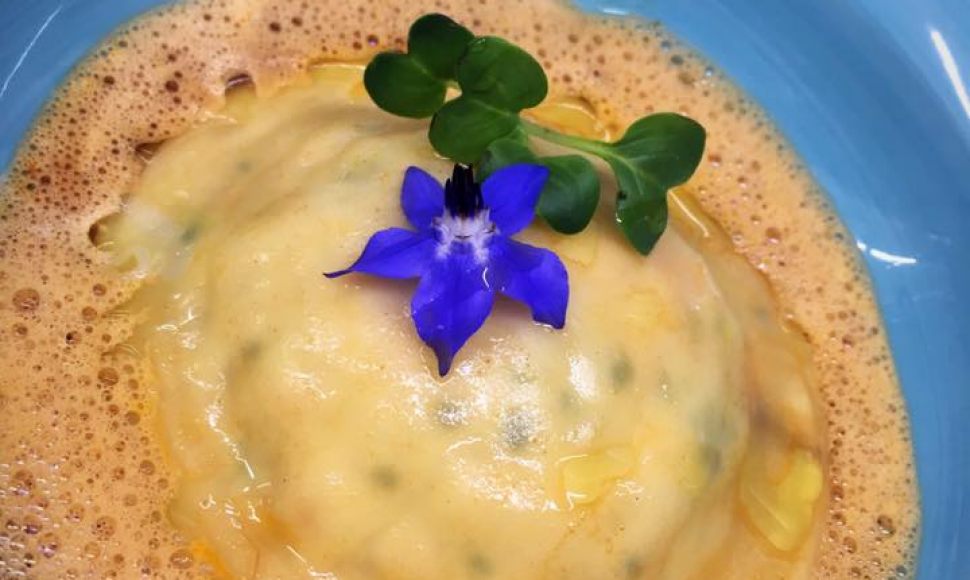 Gambas, langoustine, ricotta, raviole, martini dry.