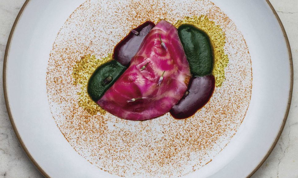 Raviole végétale, tourteau, pickles de betterave et pâte citron : une recette terre-mer pleine de promesses.