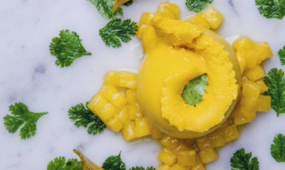 Un dessert simple mais gourmand, ces délicieuses petites ravioles à la mangue sont accompagnées d'un sorbet à la passion que l'on parsème de pesto coriandre.