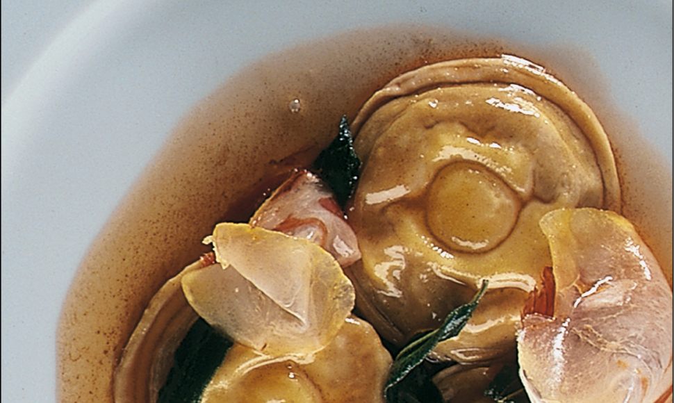 Ravioli d’artichaut et œufs de caille mollets cuits dans un bouillon de poule corsé, beurre de sauge