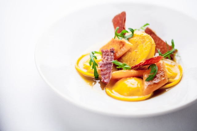 Ravioli de courges et ricotta jambon de Parme croustillant