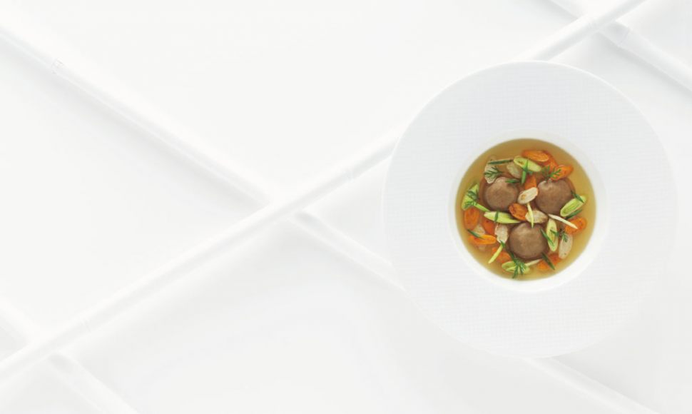 Ravioli de foie gras à la farine de châtaigne, légumes sautés à cru, bouillon corsé